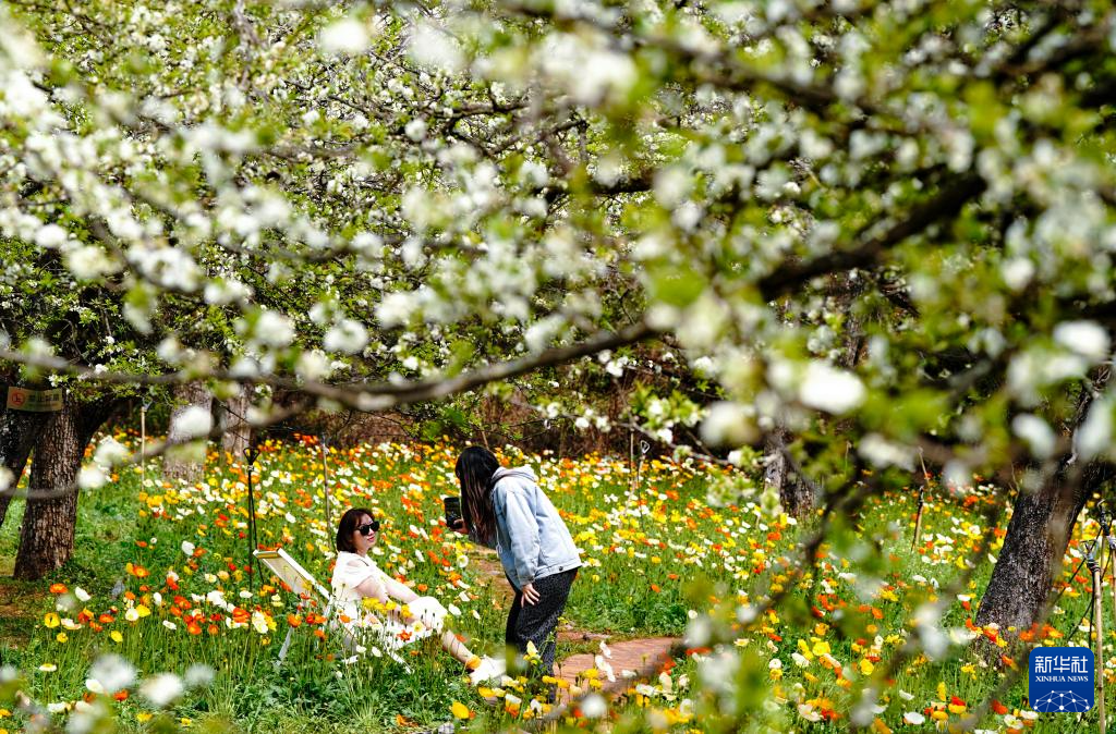 3月10日,两名游客在昆明名花谷拍照休闲。