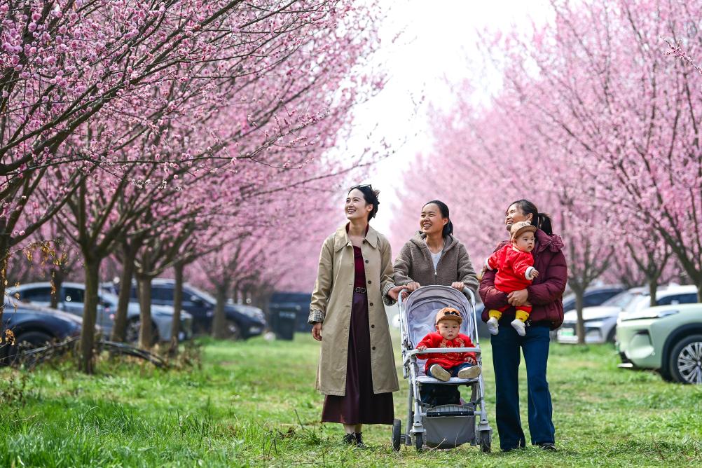 3月11日,游人在西安市鄠邑区甘河街道丁村梅花种植园内赏花。