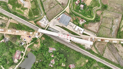 图为4月21日拍摄的合武高铁跨宁西铁路万吨连续梁转体施工现场(无人机照片)。新华社记者 周牧 摄 |