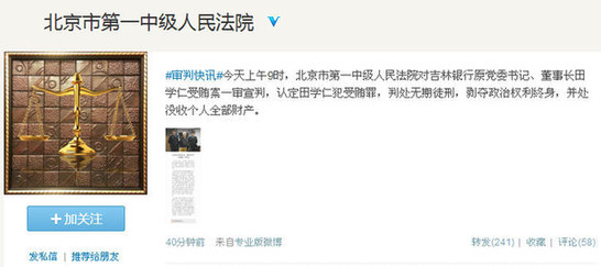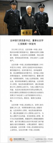 中国网11月1日讯 据北京市第一中级人民法院官方微博消息,今天上午9时,北京市第一中级人民法院对吉林银行原党委书记、董事长田学仁受贿案一审宣判,认定田学仁犯受贿罪,判处无期徒刑,剥夺政治权利终身,并处没收个人全部财产。
