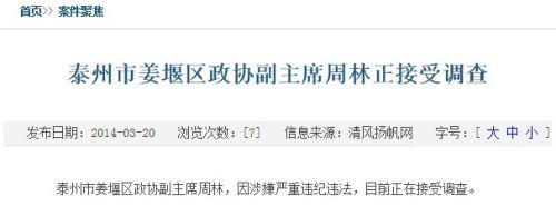 中新网3月20日电 据江苏省纪委监察厅官方网站“清风扬帆网”消息,泰州市姜堰区政协副主席周林,因涉嫌严重违纪违法,目前正在接受调查。