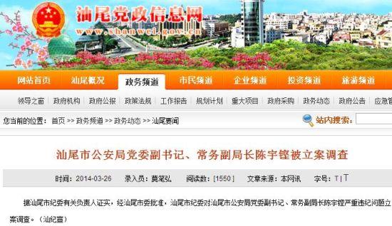 人民网北京3月27日电 据广东省汕尾市人民政府网站消息,汕尾市纪委有关负责人证实,经汕尾市委批准,汕尾市纪委对汕尾市公安局党委副书记、常务副局长陈宇铿严重违纪问题立案调查。