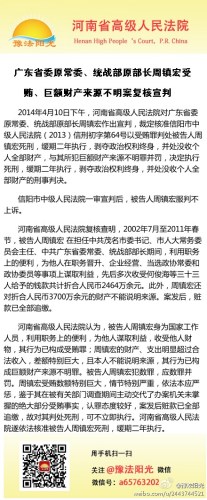 2014年4月1O日下午,河南省高级人民法院对广东省委原常委、统战部原部长周镇宏作出宣判,裁定核准信阳市中级人民击院( 2013)信刑初字第64号以受贿罪判处被告人周镇宏死刑,缓期二年执行,剥夺政治权利终身,并处没收个人全部财产,与其所犯巨额财产来源不明罪并罚,决定执行死刑,缓期二年执行,剥夺政治权利终身,并处没收个人全部财产的刑事判决。