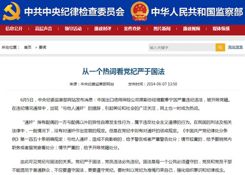 6月5日,中央纪委监察部网站曾发布消息:中国出口信用保险公司原副总经理戴春宁因严重违纪违法,被开除党籍。在违纪情况通报中,出现“与他人通奸”的措辞,引起舆论和社会的广泛关注,网上也一时成为热词。
