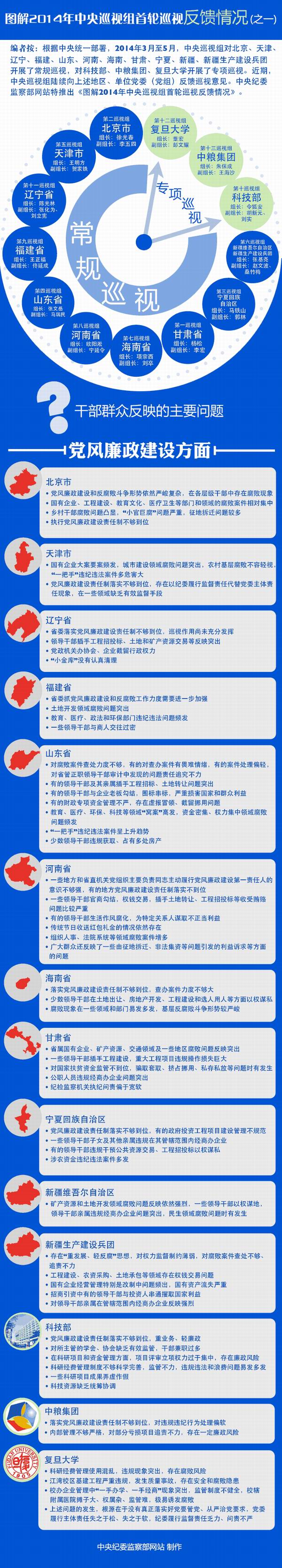 编者按:根据中央统一部署,2014年3月至5月,中央巡视组对北京、天津、辽宁、福建、山东、河南、海南、甘肃、宁夏、新疆、新疆生产建设兵团开展了常规巡视,对科技部、中粮集团、复旦大学开展了专项巡视(组长简历及联系方式)。近期,中央巡视组陆续向上述地区、单位党委(党组)反馈巡视意见。中央纪委监察部网站特推出《图解2014年中央巡视组首轮巡视反馈情况》。