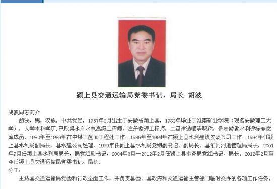 颍上县交通局胡波局长失联一事,一周前已有网民在当地论坛反映。当地民居纷纷传言“胡局长不见了”。昨天下午,新安晚报、安徽网记者登陆颖上县交通运输局官网,发现领导简介栏目中,颍上县交通运输局党委书记、局长胡波的介绍依旧排在第一位。记者浏览该网站的“交通新闻”,发现关于胡波局长的动态截止到7月1日。记者随后拔打交通局办公室电话, 一位女性工作人员在听说记者来意后,连讲了三个“我不清楚”就挂断电话。