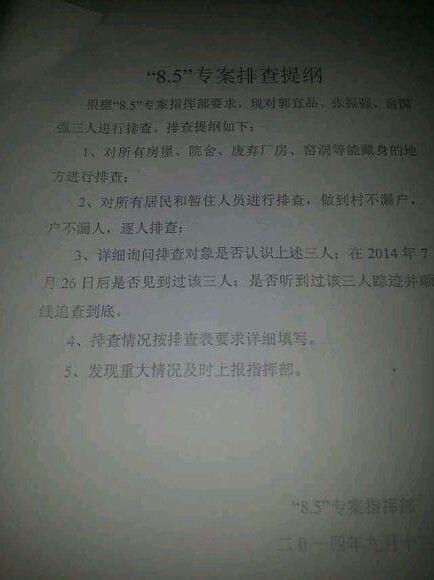 9月14日开始流传于网络的一组“8.5专案排查提纲”照片显示,有3名男子受到排查,分别是:郭宜品,1962年9月出生;张振强,1981年1月出生;俞国强,1972年4月出生。