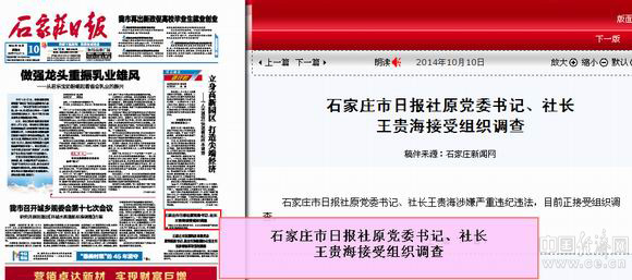 中国经济网北京10月10日综合报道 10日,石家庄日报在头版刊登该报原社长王贵海被调查消息,石家庄市日报社原党委书记、社长王贵海涉嫌严重违纪违法,目前正接受组织调查。