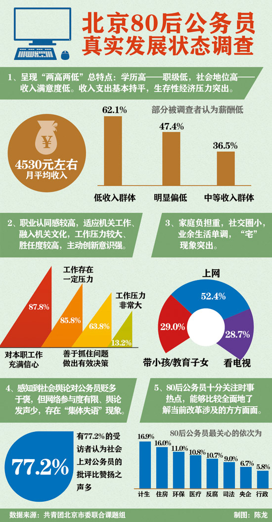 2015年年初,《北京80后公务员真实发展状态调查》出炉。这是团北京市委联合课题组通过问卷调查和面对面访谈,对全市80后公务员群体进行的一次深入调研。问卷共发放2417份,回收2327份。样本按调研对象总体结构确定,覆盖市、区县及街乡各层级,包括党委、政府、法院检察院等各类机关,综合管理、行政执法等各类岗位。