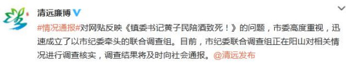 中新网3月16日电 据广东省清远市纪委、监察局官方微博消息,对网贴反映《镇委书记黄子民陪酒致死!》的问题,清远市委高度重视,迅速成立了以市纪委牵头的联合调查组。目前,市纪委联合调查组正在阳山对相关情况进行调查核实,调查结果将及时向社会通报。