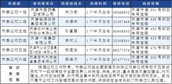 根据市委部署要求,市委6个巡视组将于近日分别进驻天津市医药集团有限公司、天津能源投资集团有限公司、天津农村商业银行股份有限公司、天津一商集团有限公司、天津市公共交通集团(控股)有限公司、天津百利机械装备集团有限公司等6家市管国有企业,开展专项巡视。