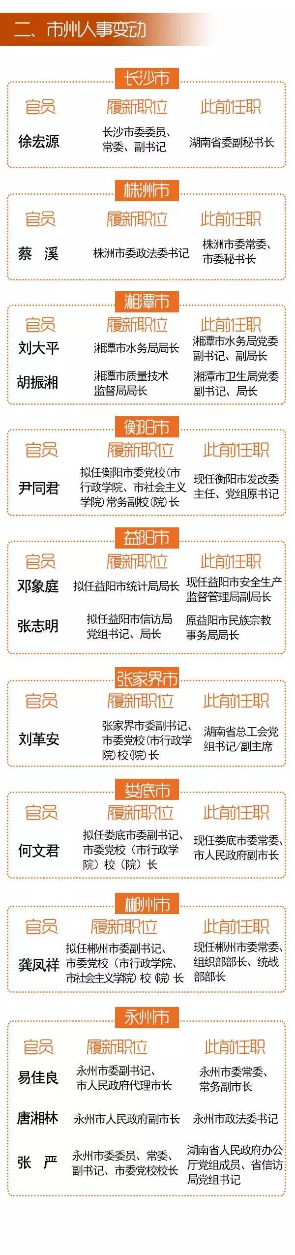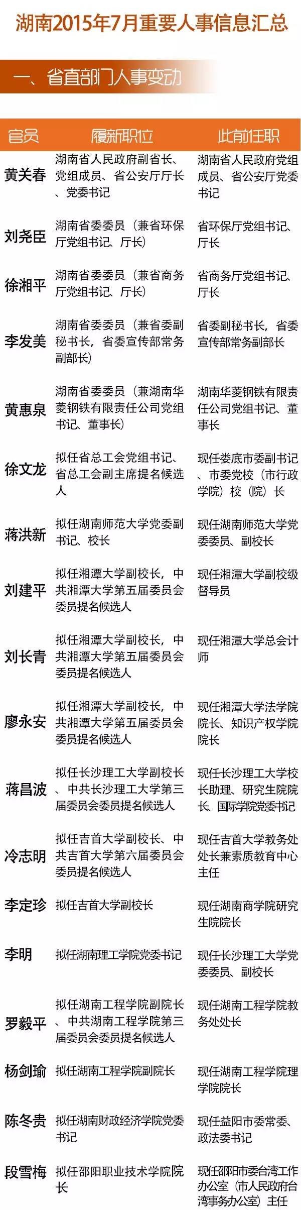 7月,湖南部分省直部门和市州迎来较大面积人事调整。其中,黄关春任人民政府副省长、省公安厅厅长,刘尧臣、徐湘平、李发美、黄惠泉四人履新省委委员。