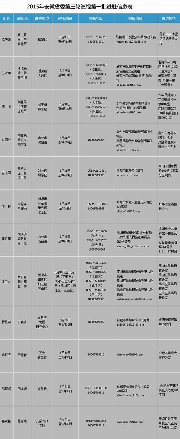 中国经济网北京9月8日综合报道 据中央纪委监察部网站消息,2015年安徽省委第三轮巡视工作已全面展开,共对40个地区和单位开展巡视。目前,巡视组已经第一批进驻23个地区和单位,第二批进驻工作将在10月份开展,对其余17个地区和单位进行巡视。