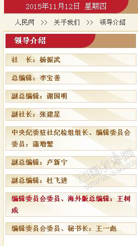 中国经济网北京11月12日综合报道 据人民网官网“领导介绍”栏目显示:王树成任人民日报社编辑委员会委员、海外版总编辑,张德修不再担任。