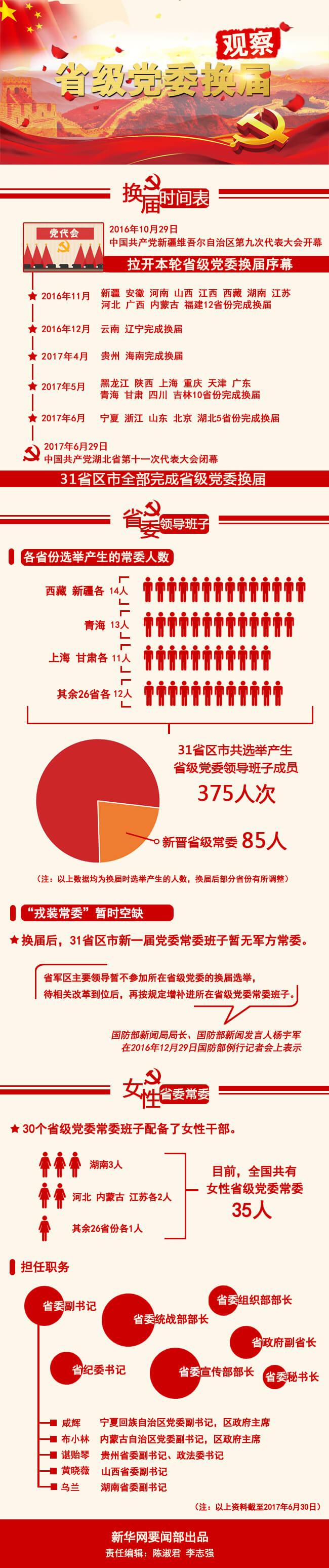 2016年11月至12月,新疆、安徽、河南等14个省级党委完成换届,2017年4月至6月,贵州、海南、黑龙江等17个省级党委相继完成换届。换届较密集的月份是去年11月和今年5月,分别有12个和10个省份完成省级党委换届。四个直辖市中,除北京在6月完成市委换届,上海、重庆、天津均在5月完成市委换届。