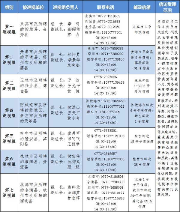据悉,本轮巡视将持续1个月左右,每个巡视组都公布了值班电话和专门邮政信箱。根据巡视工作条例及有关规定,巡视组主要受理反映被巡视单位党组织领导班子及其成员、领导干部贯彻落实中央和自治区党委扶贫决策部署不力、对各项扶贫督查检查发现问题整改不力,特别是政策不落实、问题不整改、搞数字脱贫、虚假脱贫问题的来信来电来访,重点是关于扶贫领域损害群众利益行为的举报和反映。其他不属于巡视受理范围的信访问题,将按规定由被巡视单位和有关部门认真处理。
