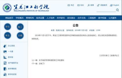 黑龙江工程学院官网13日发布消息, 2018年11月12日下午,黑龙江工程学院党委书记李耀东被发现在其办公室自缢身亡,经公安机关现场勘查取证,排除他杀。