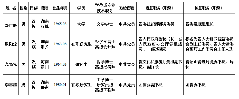 为了加强对干部选拔工作的监督,提高识别和任用干部的准确程度,现对省委常委会会议研究决定的下列拟任人选(提名人选)进行任前公示: