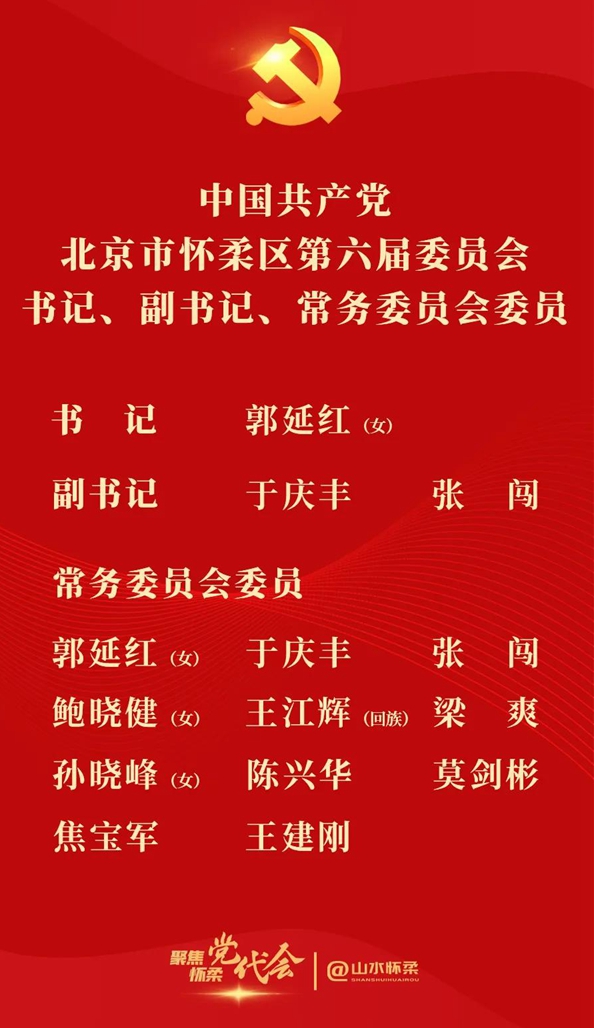 12月9日上午,中国共产党北京市怀柔区第六次代表大会胜利闭幕。当天下午,六届区委召开第一次全体会议,郭延红当选区委书记,于庆丰、张闯当选区委副书记。