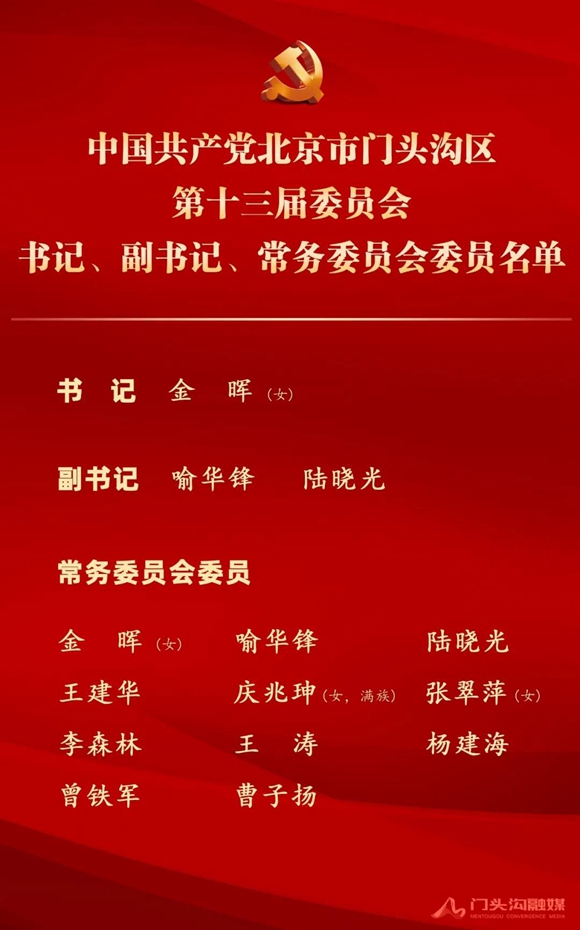 全会选举产生中国共产党北京市门头沟区第十三届委员会常务委员会委员和区委书记、区委副书记;表决通过十三届区纪委一次全会选举产生的区纪委常务委员会委员和书记、副书记名单。