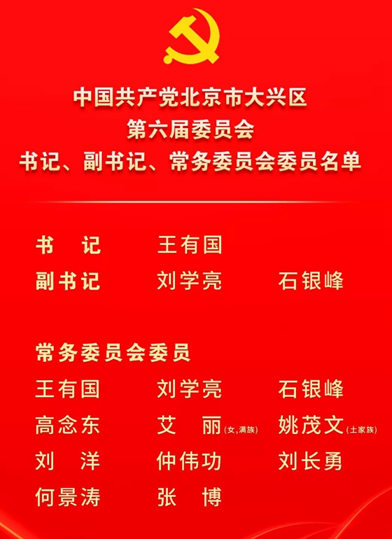 12月10日下午,中国共产党北京市大兴区第六届委员会召开第一次全体会议。王有国当选为区委书记,刘学亮、石银峰为区委副书记。