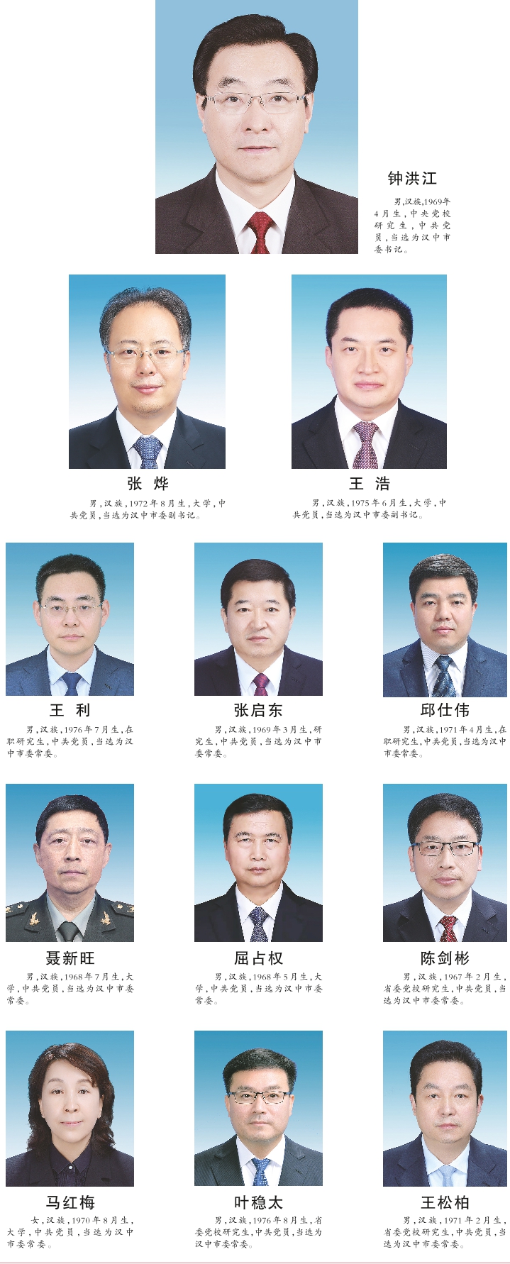 3月22日,中国共产党汉中市第六届委员会举行第一次全体会议,选举产生了第六届市委常务委员会委员。钟洪江当选汉中市委书记,张烨、王浩当选市委副书记,王利、张启东、邱仕伟、聂新旺、屈占权、陈剑彬、马红梅、叶稳太、王松柏当选市委常委。