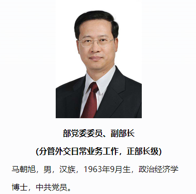 马朝旭,1963年9月生,曾任外交部部长助理,中国驻澳大利亚大使,中国常驻联合国日内瓦办事处代表,中国常驻联合国代表等职,2019年起任外交部副部长。