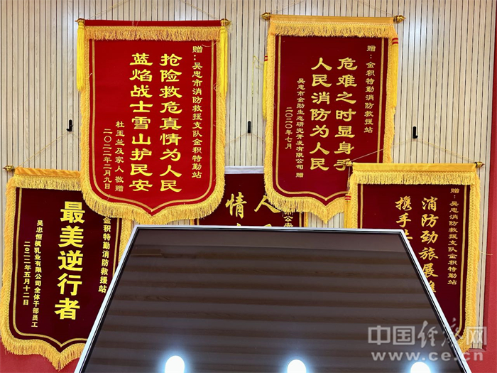 吴忠市消防救援支队金积特勤站获赠的部分锦旗。中国经济网记者 宋雅静/摄