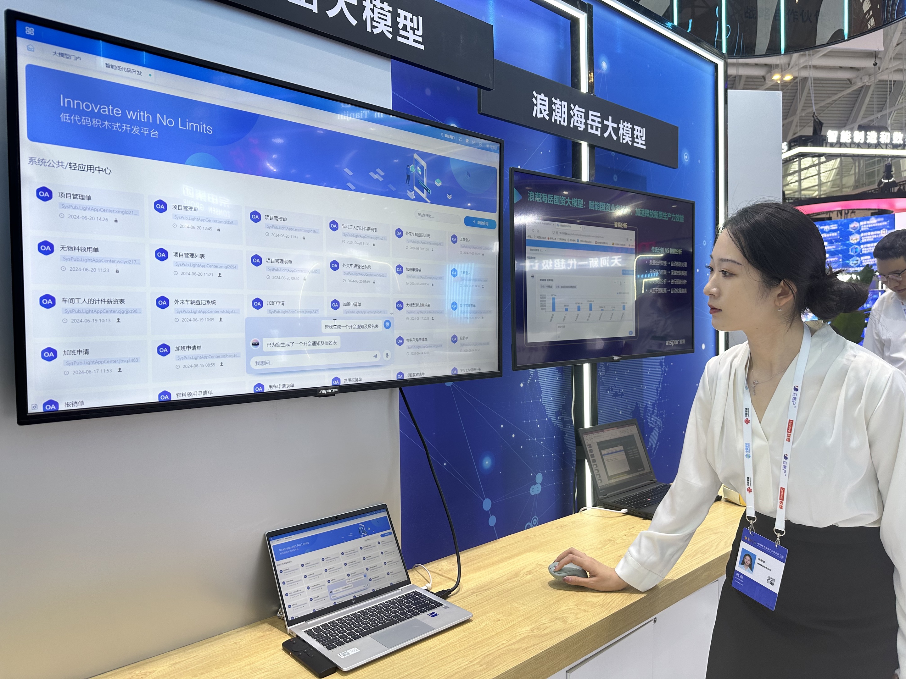 2024年是大模型应用年。浪潮海岳软件、浪潮海岳大模型等产品、解决方案亮相展区,其中,海岳大模型凭借智能文档撰写、对话式数据分析、智能低代码开发等亮点功能吸引了众多媒体、观众的驻足交流、互动,记者也在展台体验了使用大模型编程,通过指令自动生成多种工具,功能强大。