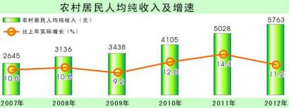 全年农村居民人均纯收入5763元,比上年增加735元,增长14.6%,扣除价格因素实际增长11.2%。其中,工资性收入2728元,增长14.4%,占纯收入的比重为47.3%;家庭经营收入2295元,增长13.1%,占39.8%;财产性收入200元,增长21%,占3.5%;转移性收入540元,增长20.1%,占9.4%。农村居民人均生活消费支出5115元,比上年增加619元,增长13.8%。农民人均住房建筑面积38.34平方米,比上年增长3.18%。