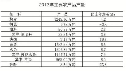 全年造林面积327.96千公顷,比上年减少2.3%。板栗产量7.2万吨,增长4.1%;核桃产量19.67万吨,增长39.2%;花椒产量6.17万吨,增长16.5%。水产品产量12.45万吨,增长13.5%。