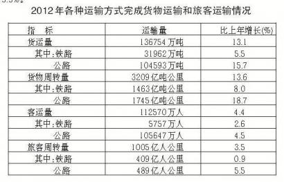 全年货运量13.68亿吨,比上年增长13.1%;货物周转量3209亿吨公里,增长13.6%。客运量11.26亿人,增长4.4%;旅客周转量1005亿人公里,增长3.5%。