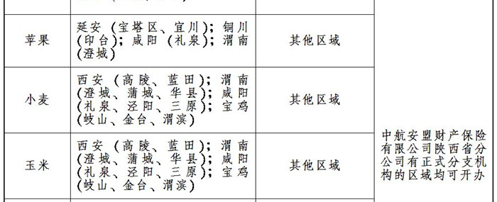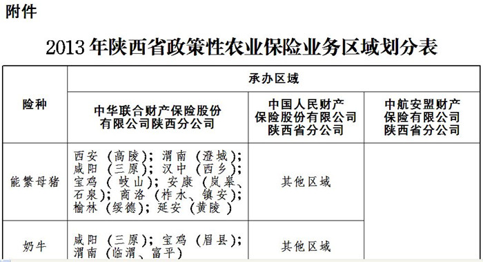 其余15个品种由中国人民财产保险股份有限公司陕西省分公司、中华联合财产保险股份有限公司陕西分公司、中航安盟财产保险有限公司陕西省分公司三家公司承办。各险种的承办机构和区域划分见附表。