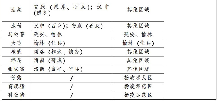 能繁母猪、奶牛保险在全省范围内采取重点扶持规模化养殖企业和小区的方式开展,试点规模分别为71万头、13万头;育肥猪、仔猪、种公猪在杨凌示范区开展,试点规模分别为2万头、1万头、2000头;小麦保险在西安市、宝鸡市、咸阳市、铜川市、渭南市开展,试点面积400万亩;玉米保险在西安市、宝鸡市、咸阳市、铜川市、渭南市、榆林市开展,试点面积330万亩;油菜保险在咸阳市、汉中市、安康市开展,试点面积60万亩;水稻保险在汉中市、安康市开展,试点面积60万亩;马铃薯保险在延安市、榆林市开展,试点面积20万亩;棉花保险在渭南市开展,试点面积20万亩;森林保险在全省范围内开展,试点面积6400万亩;苹果保险在宝鸡市、咸阳市、铜川市、渭南市、延安市开展,试点面积65万亩;核桃保险在商洛市开展,试点面积7万亩;大枣保险在榆林市开展,试点面积1万亩;设施蔬菜“银保富”在宝鸡市、咸阳市、渭南市、商洛市、杨凌示范区开展,试点面积25万亩;花椒保险在宝鸡市开展,试点面积5万亩。