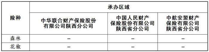 注:1.“其他区域”指在该险种试点区域内,除中华联合财产保险公司承办区域以外的县区。2.“/”表示不承办该险种。3.森林保险由人保财险、中华联合、中航安盟、永安保险、阳光财险、平安财险六家保险机构共保,花椒保险由凤县政府确定承办机构和承保模式。